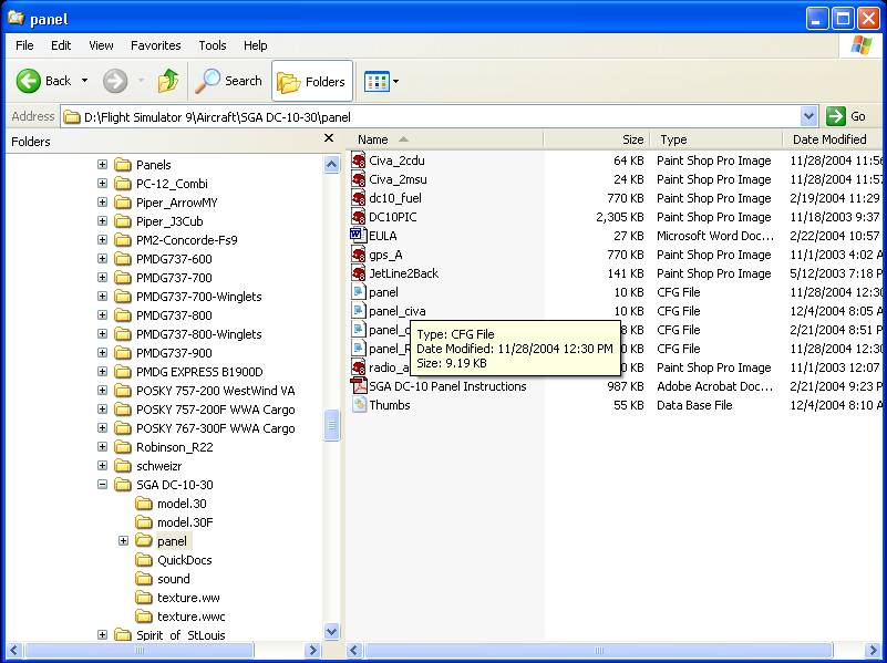 Choice one of three panel configurations, DC-10-30 by SGA, DC-10-30 by SGA with CIVA Dual INS, and DC-10-30 by SGA with Dual CIVA INS and RealityXP Jetline 2 EFIS. INS version requires that you download and install the Civa INS separately available here. EFIS version requires that you own the commercial product RealityXP Jetline 2 gauges. To choose your panel browse to the Flight Simulator 9/aircraft/SGA DC-10-30/panel folder. Delete the panel.cfg, then rename the panel you wish to use to panel.cfg